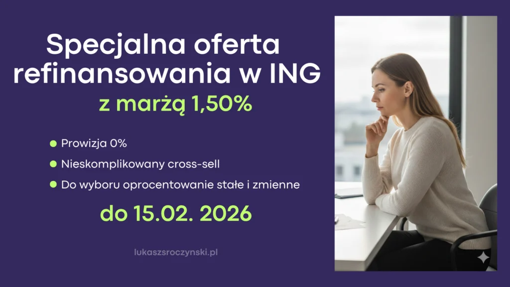 Od dziś, 19 stycznia 2026, ING Bank Śląski bez wcześniejszych zapowiedzi udostępnił wyjątkowo korzystną ofertę refinansowania kredytu hipotecznego. Marża promocyjnej oferty ING wynosi jedynie 1,5%. Od kilku już miesięcy powoli standardem robiły się marże poniżej 2%, natomiast marża 1,5% dostępna dla szerokiego grona klientów to zdecydowanie przełom.